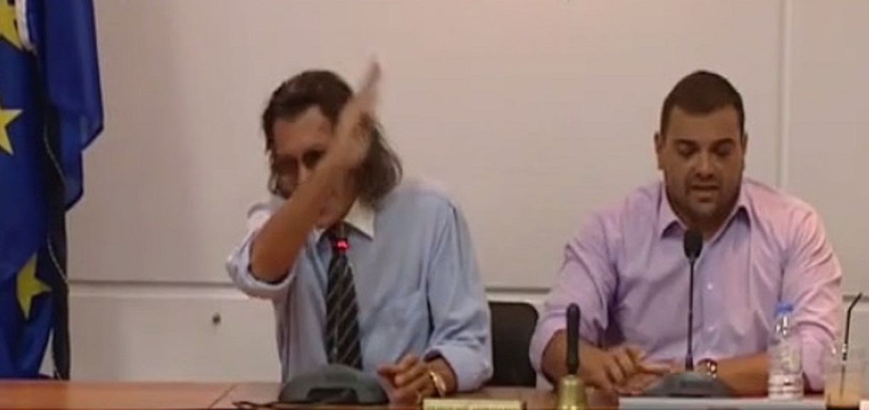 Η συνεδρίαση στο δημοτικό συμβούλιο ξεκίνησε με καθυστέρηση 50 λεπτών, και στο τέλος της ομιλίας του δημάρχου δημιουργήθηκε ένταση, όταν στο τέλος της ομιλίας του κάθησε κοντά στους πυρόπληκτους που παρευρίσκοντο εκεί.