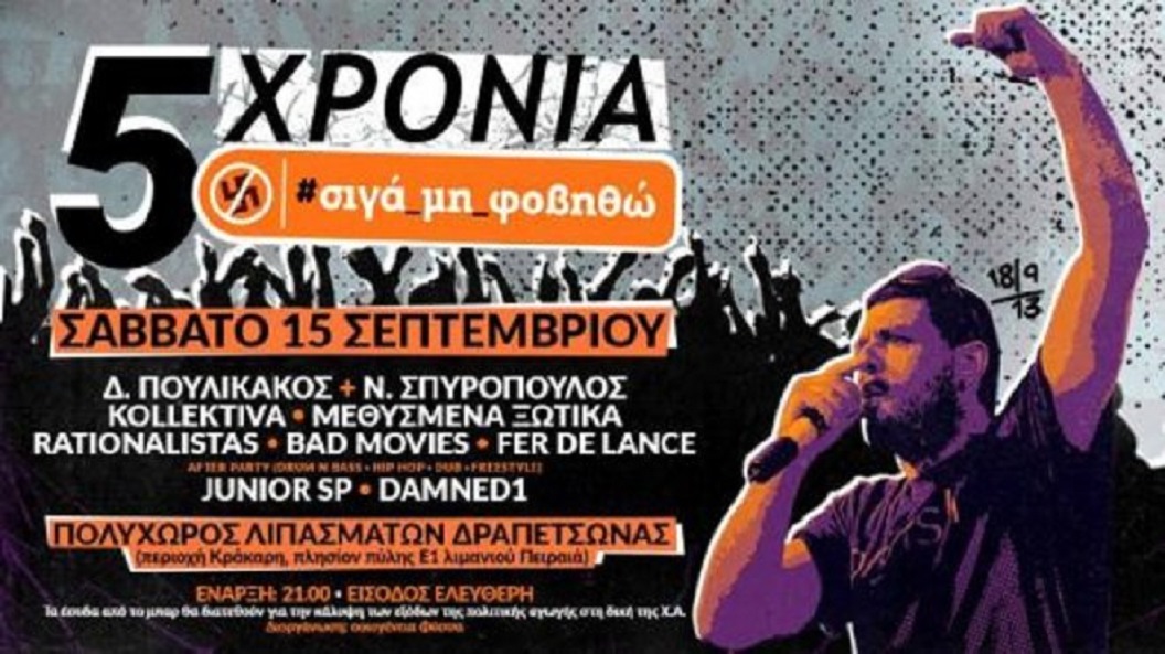 Μεγάλη συναυλία θα πραγματοποιηθεί σήμερα 15 Σεπτεμβρίου, στο νέο χώρο των Λιπασμάτων του Δήμου Κερατσινίου-Δραπετσώνας με τίτλο «5 ΧΡΟΝΙΑ ΣΙΓΑ ΜΗ ΦΟΒΗΘΩ», στη μνήμη του Παύλου Φύσσα, που δολοφονήθηκε από το μέλος της Χρυσής Αυγής Γιώργο Ρουπακιά.