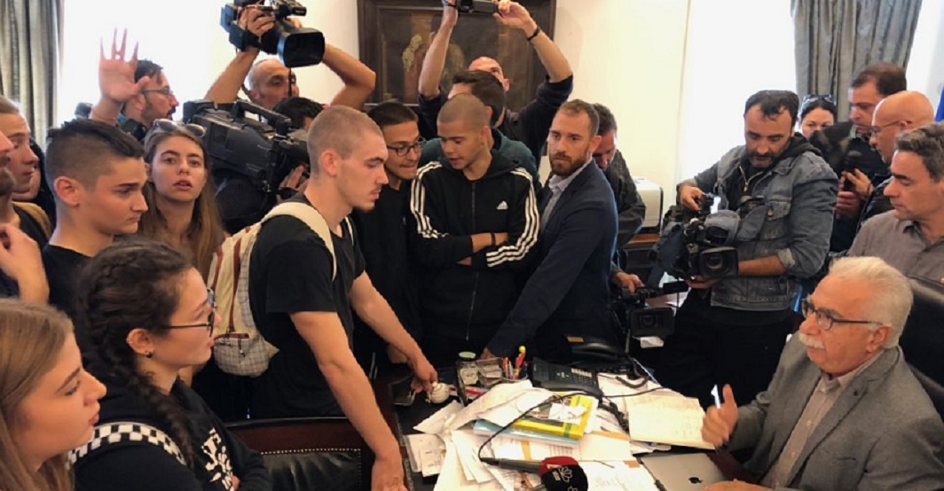 Στη συνέχεια όμως κινήθηκαν μέσα στο χώρο του υπουργείου και στους διαδρόμους φτάνοντας μέχρι το γραφείο του υπουργού. Μπήκαν μέσα με τον υπουργό να κάθεται στη θέση του ψύχραιμος και τους μαθητές και φοιτητές να φωνάζουν και να καταθέτουν τα αιτήματά τους.