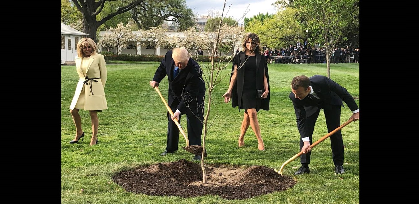 Οι δύο ηγέτες μαζί με τις συζύγους τους, κρατώντας φτυάρια στα χέρια φύτεψαν το δέντρο, το οποίο πήγε μαζί του ως δώρο ο Γάλλος πρόεδρος στην επίσκεψή του στην Ουάσιγκτον και οι φωτογραφίες από το στιγμιότυπο έκαναν το γύρο του διαδικτύου και όλου του κόσμου.