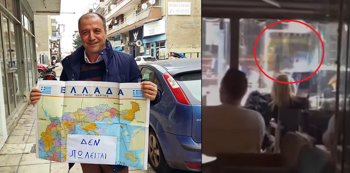 Ο Ηλίας Πλιόγκας, αφού έγραψε σε χάρτη της Μακεδονίας με κεφαλαία γράμματα ΔΕΝ ΠΩΛΕΙΤΑΙ, τον κόλλησε στο τζάμι του καταστήματος που η κ. Τζάκρη έπινε τον καφέ της. Αν κρίνουμε από το βίντεο, η βουλευτής του ΣΥΡΙΖΑ δεν αντέδρασε, παρόλο που ο χάρτης της έκρυβε τη θέα.