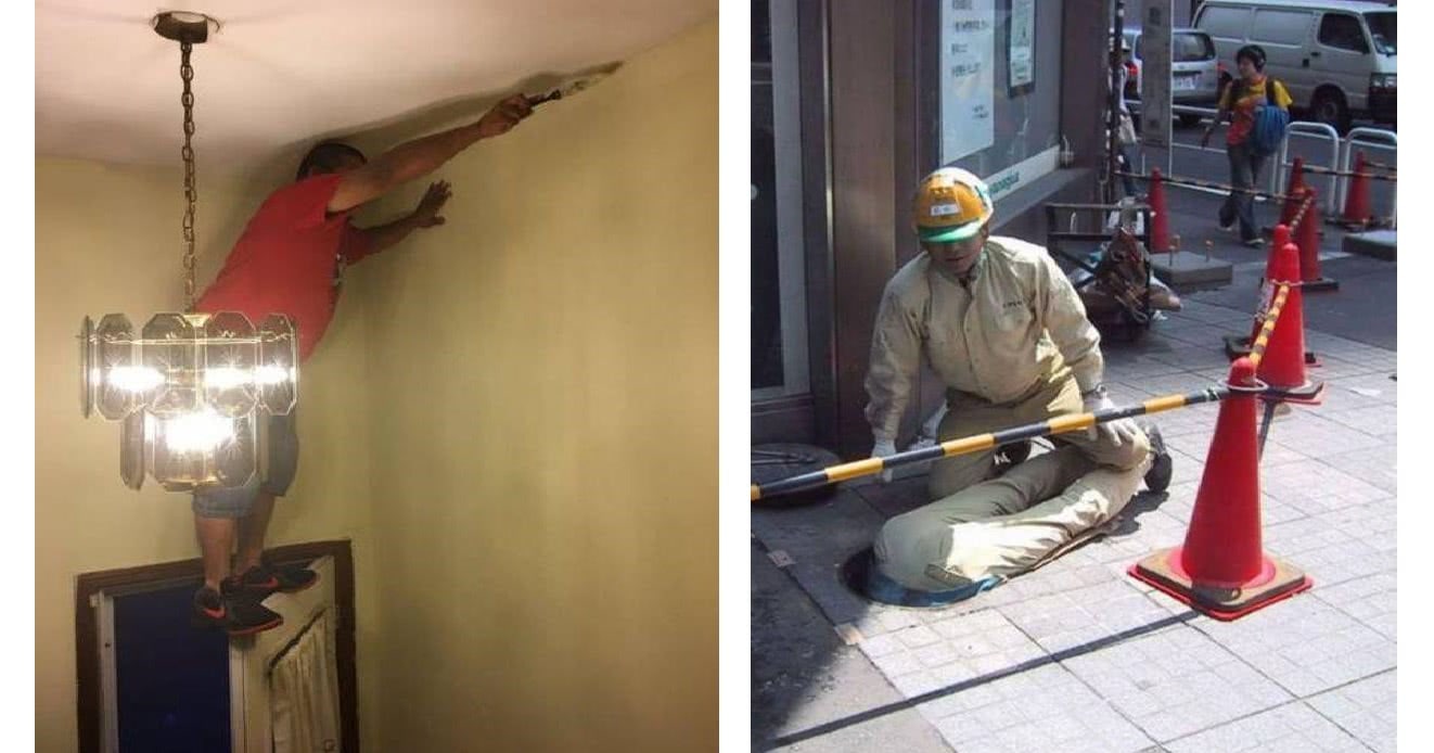 Οι έξυπνες φωτογραφίες που έχουν αναρτηθεί, δείχνουν ότι οι άνδρες διακινδυνεύουν την ζωή τους αν δουλεύουν σε χειρονακτική εργασία και πάντα βιάζονται για να την τελειώσουν.