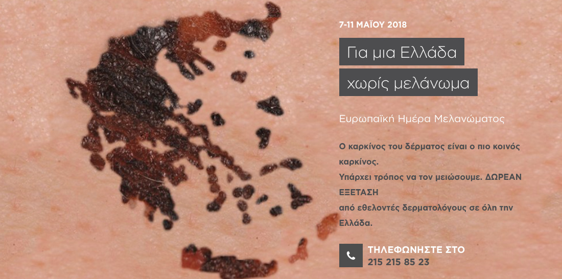 Η Ελληνική Δερματολογική και Αφροδισιολογική Εταιρία (ΕΔΑΕ), μας δίνει την δυνατότητα δωρεάν εξέτασης για καρκίνο του δέρματος και πιθανό μελάνωμα, στα πλαίσια της Ελληνικής Εβδομάδας Κατά του Καρκίνου του Δέρματος. Η δωρεάν εξετάσεις που ξεκίνησαν εχθές 7 Μαΐου και ολοκληρώνονται την Παρασκευή 11 Μαΐου 2018.