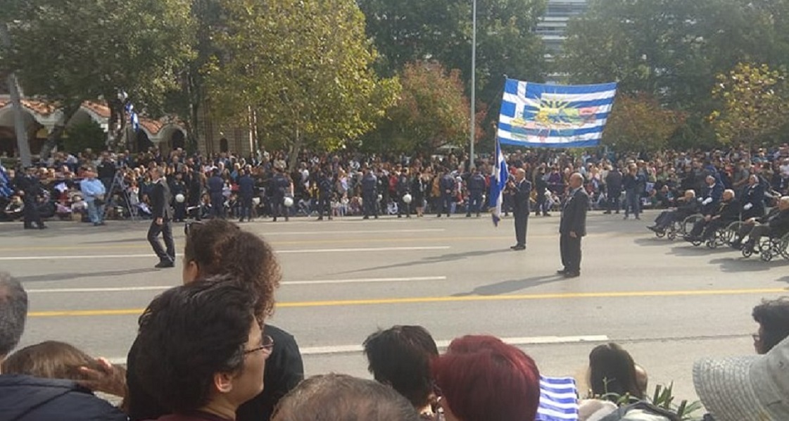 Ελληνική σημαία που είχαν προσθέσει τον χάρτη της Μακεδονίας, ύψωσαν σήμερα διαδηλωτές κατά της συμφωνίας των Πρεσπών στη Θεσσαλονίκη, κατά τη διάρκεια της στρατιωτικής παρέλασης για τον εορτασμό της 28ης Οκτωβρίου.
