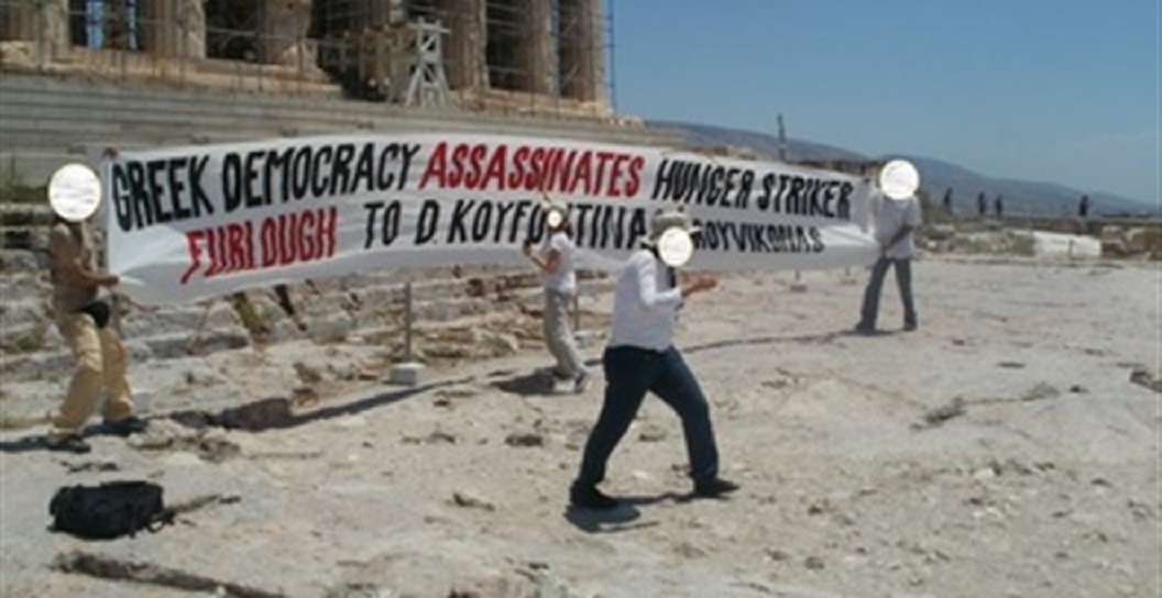 Η αναρχική ομάδα του Ρουβίκωνα, έκανε έφοδο στον ιερό λόφο της Ακρόπολης αναρτώντας τεράστιο πανό υπέρ του Δημήτρη Κουφοντίνα, ζητώντας να του χορηγηθεί η άδεια για την οποία βρίσκεται σε απεργία πείνας και κατηγορώντας την πολιτεία ότι σκοτώνει τον Λουκά της 17 Νοέμβρη.