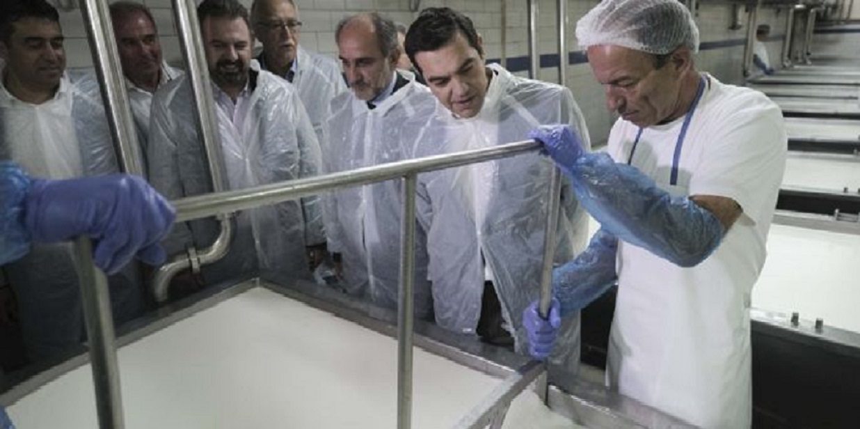 Φορώντας μία λευκή ρόμπα «εργαστηρίου», ο πρωθυπουργός παρακολουθούσε με προσοχή όλη τη διαδικασία παραγωγής, στον Αγροτικό και Γαλακτοκομικό Συνεταιρισμό Καλαβρύτων, κατά την επίσκεψή του εκεί.