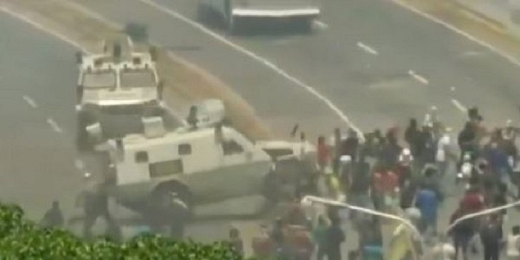 Στο μεταξύ, βίντεο που δείχνει όχημα της Εθνικής Φρουράς να πέφτει πάνω σε διαδηλωτές στο Καράκας κάνει το γύρο του διαδικτύου, προκαλώντας σοκ. Σύμφωνα με τις έως τώρα πληροφορίες, οι συγκεντρωμένοι εκτόξευσαν πέτρες και χτυπούσαν τα οχήματα με ρόπαλα ενώ από την πρόσκρουση του οχήματος σε διαδηλωτές υπήρξαν τραυματίες.